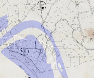 In azzurro l’attuale corso del Brenta e la “Busa Bastianeo”.La zona dalle righe bianca è la correzione fatta sulle carte catastali nel 1841delle terre “distrutte dal Brenta”